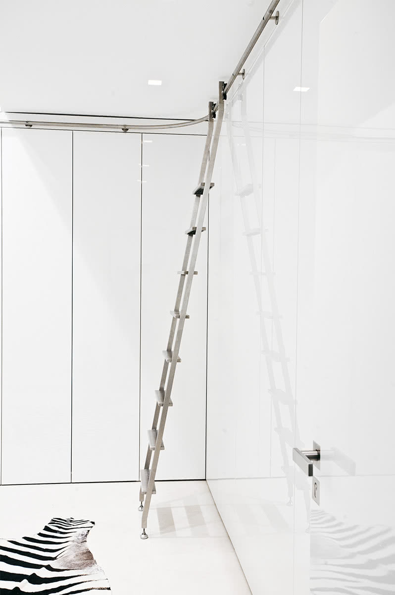 Die Vario-Schiebeleiter verbindet gekonnt über Eck liegende Regal- oder Schranksysteme.