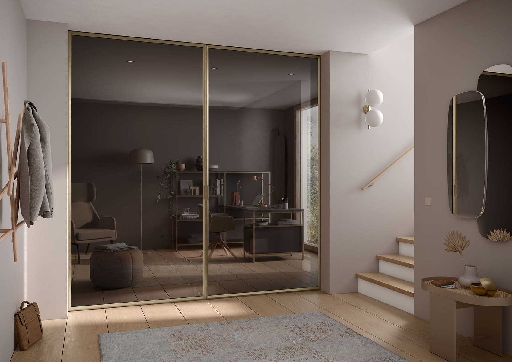 In den eloxierten und gebürsteten Farbvarianten Kupfer, Champagner, und Schwarz lässt die Facettierung die Profile in verschiedenen Nuancen reizvoll changieren. Zusätzliche Gestaltungsmöglichkeiten bietet der Einsatz von maximal zwei füllungstrennenden Horizontal-Sprossen. Ein bündig mit dem Profil abschließender Griff passt sich dessen Formgebung harmonisch an, ohne ins Blickfeld zu ragen.